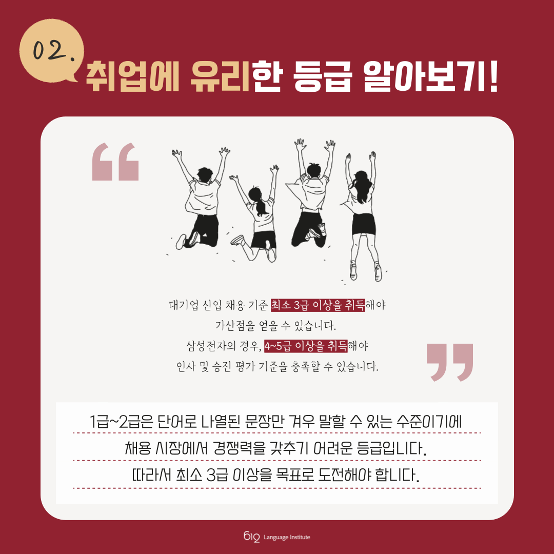 대기업 신입사원 채용 기준을 보면, 최소 3급 이상을 취득해야 가산점을 얻을 수 있습니다.